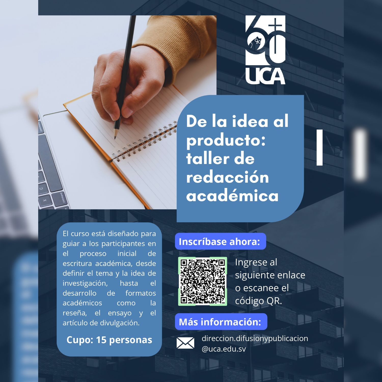 El curso De la idea al producto: taller de redacción académica está diseñado para guiar a los participantes en el proceso inicial de escritura académica, desde definir el tema y la idea de investigación, hasta el desarrollo de formatos académicos como la reseña, el ensayo y el artículo de divulgación. Mediante una metodología práctica y aplicada, se busca dotar a los investigadores de herramientas y estrategias que les permitan comenzar con el recorrido de su producción académica de la UCA.