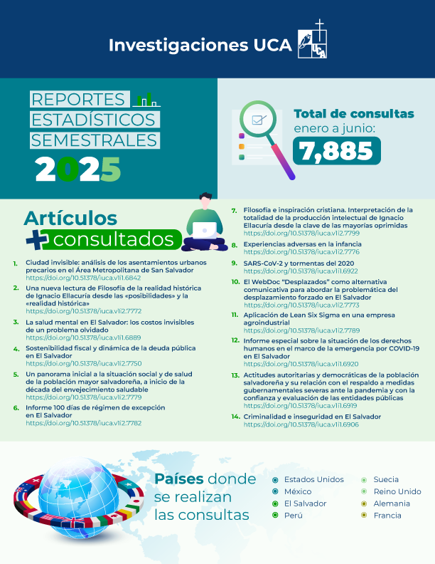 En ese sentido, cabe señalar que las revistas de la UCA son consultadas desde varios países, lo que evidencia su alcance global, y entre los cuales están Canadá, Estados Unidos, México, Guatemala, El Salvador, Honduras, Costa Rica, Colombia, Perú, Chile, Argentina, Brasil, Ecuador, Bolivia, Reino Unido, Alemania, Francia, Austria, España, Singapur, Países Bajos y Bélgica.